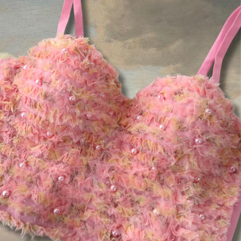 Bustier ini dibuat dari bahan sifon premium dengan detail flower ruffle cantik yang dihiasi payet sequin serta mutiara kecil yang menambah kesan elegan. Dilengkapi tulangan di bagian depan untuk memberi bentuk lebih fit di tubuh, serta kancing pengait adjustable di bagian belakang yang membuatnya nyaman dipakai.
