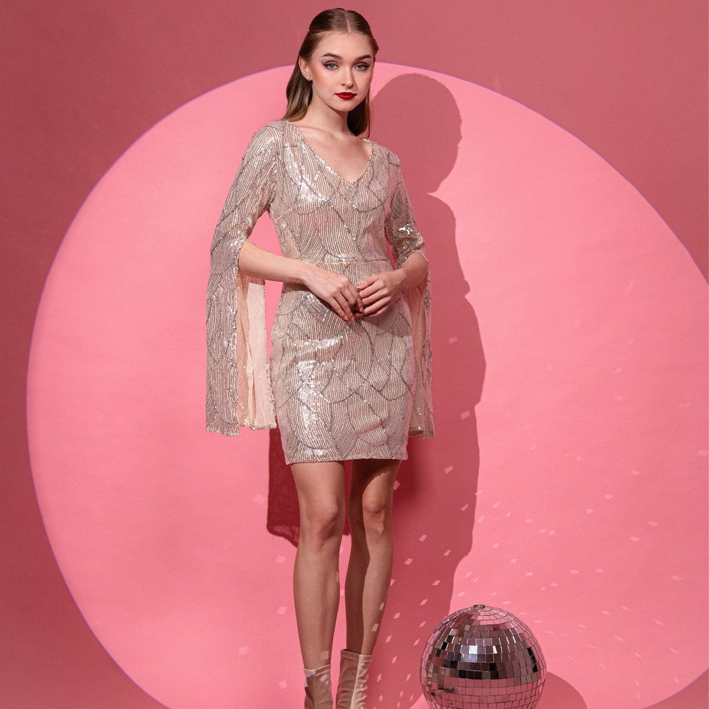 Aliciacouture - Reine Sequin Dress Mini - Lengan Panjang Elegan Silver Gold untuk Pesta & Formal