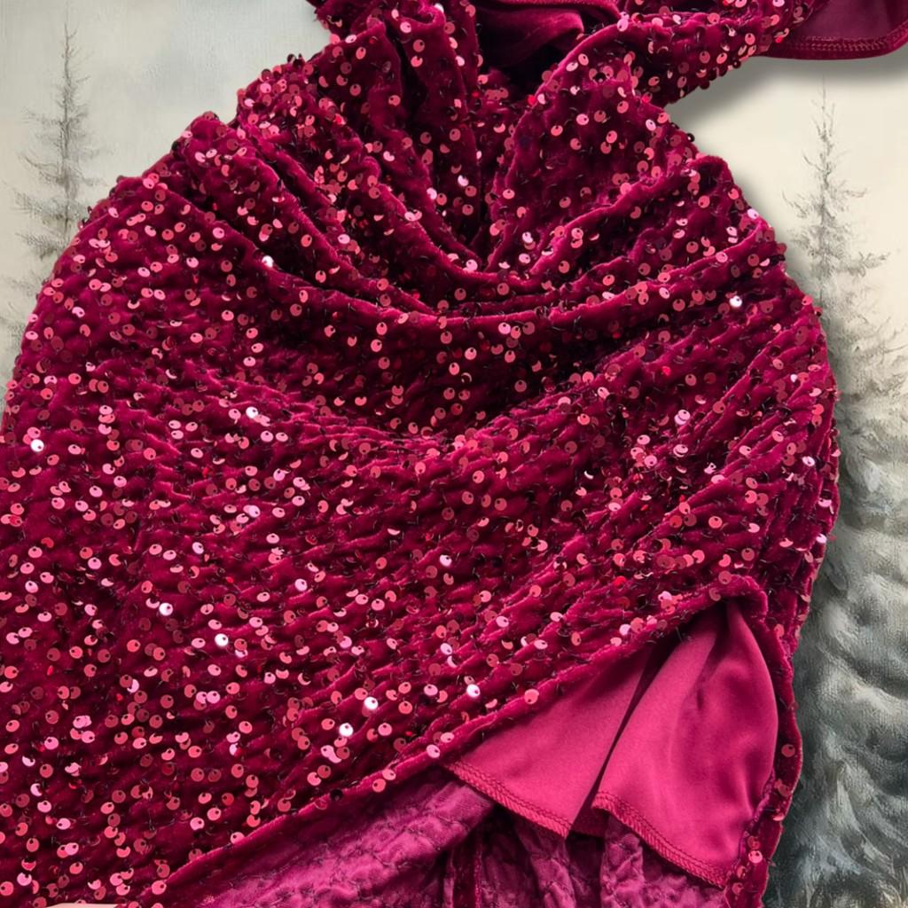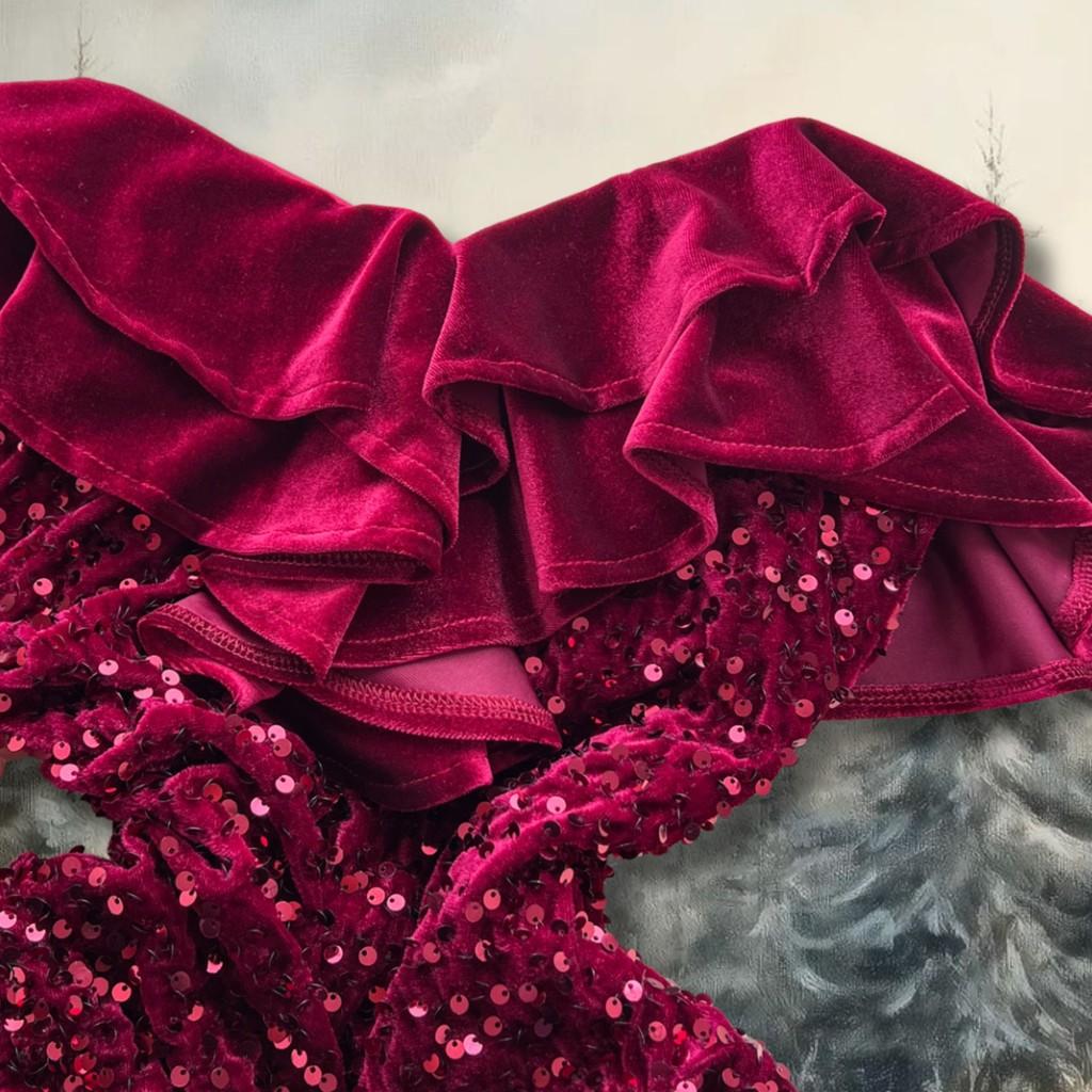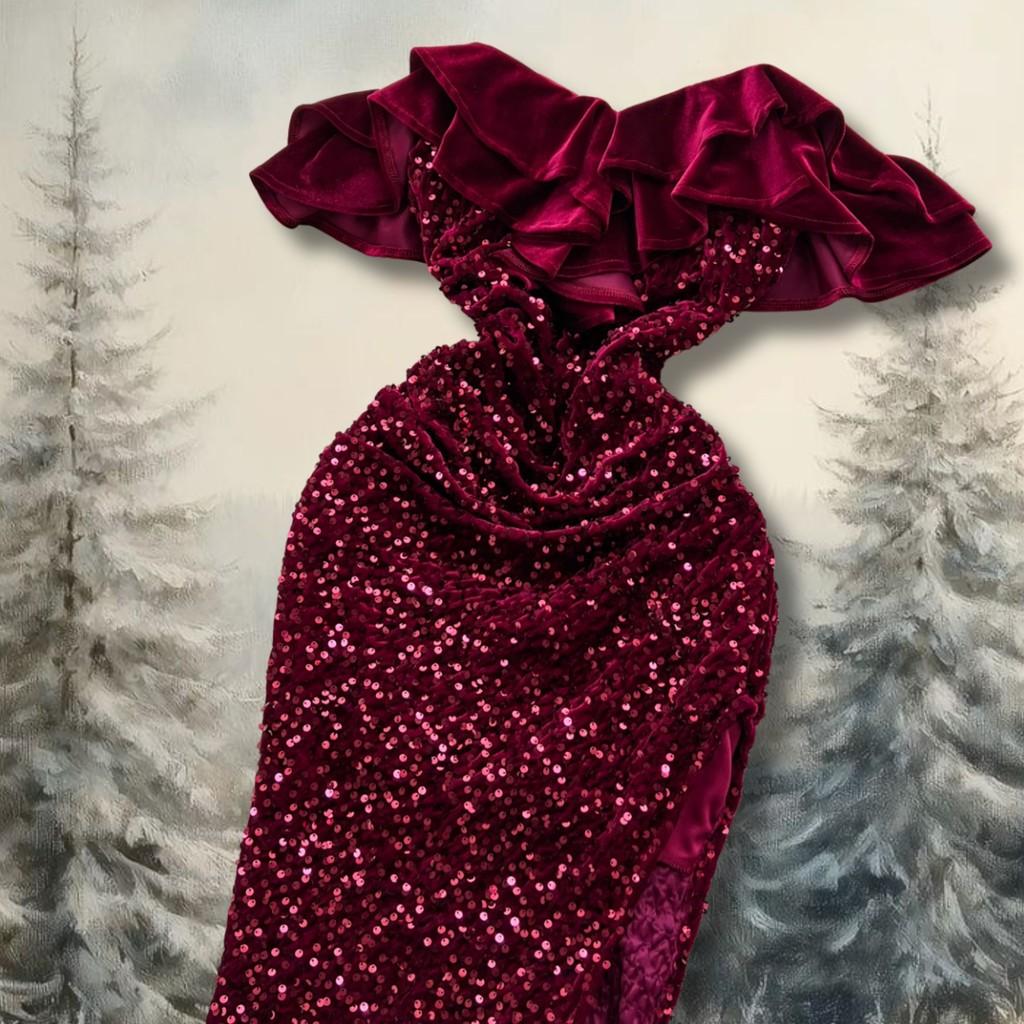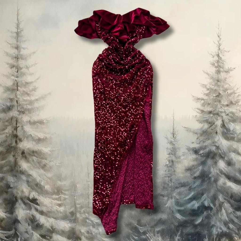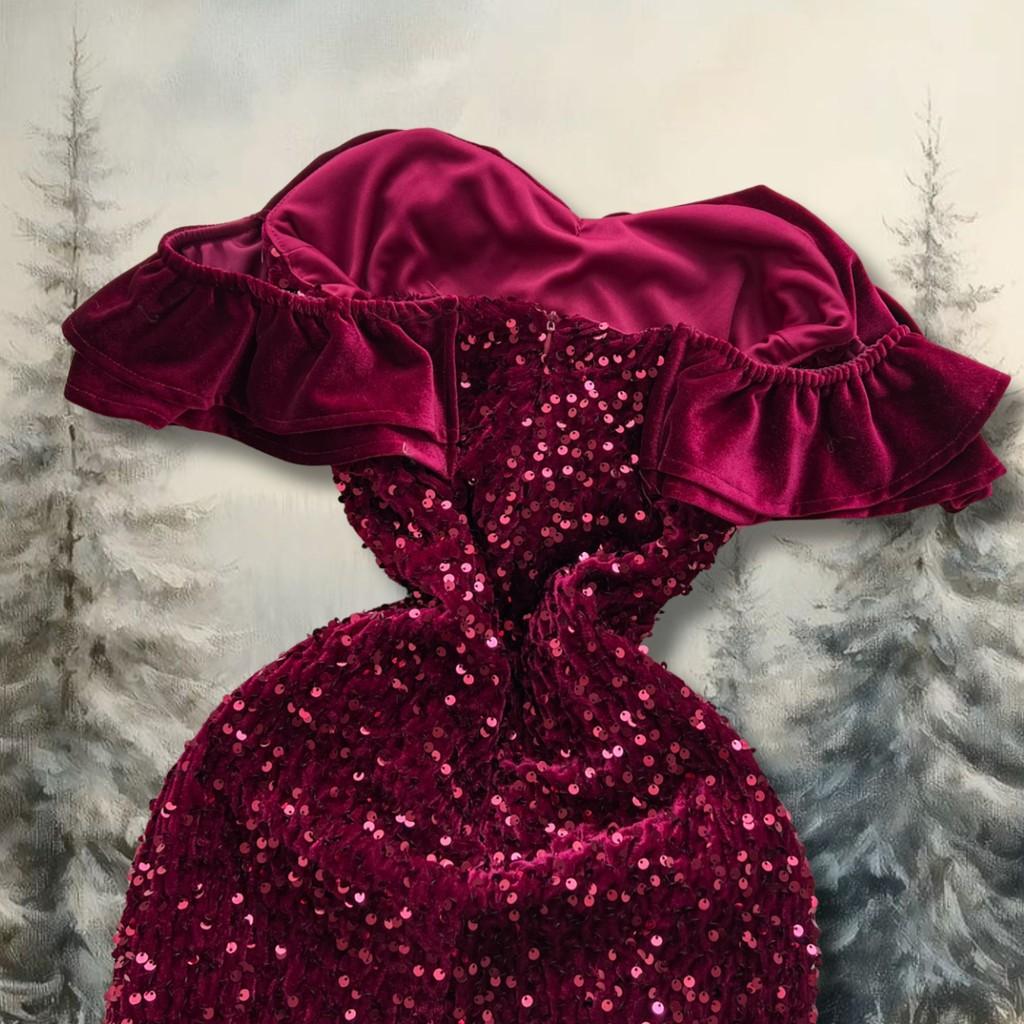 Elegan di setiap momen spesial dengan Camille Sequin Party Maroon Dress. Dress ini pas banget untuk pesta, acara formal, atau dinner glam. Terbuat dari velvet tebal berlapis full sequin, tampilannya memancarkan kemewahan yang langsung bikin standout. Detail off-shoulder ruffle menonjolkan siluet tubuh dengan anggun, sementara warna maroon yang bold memberi kesan glamour sekaligus classy untuk look penuh percaya diri.