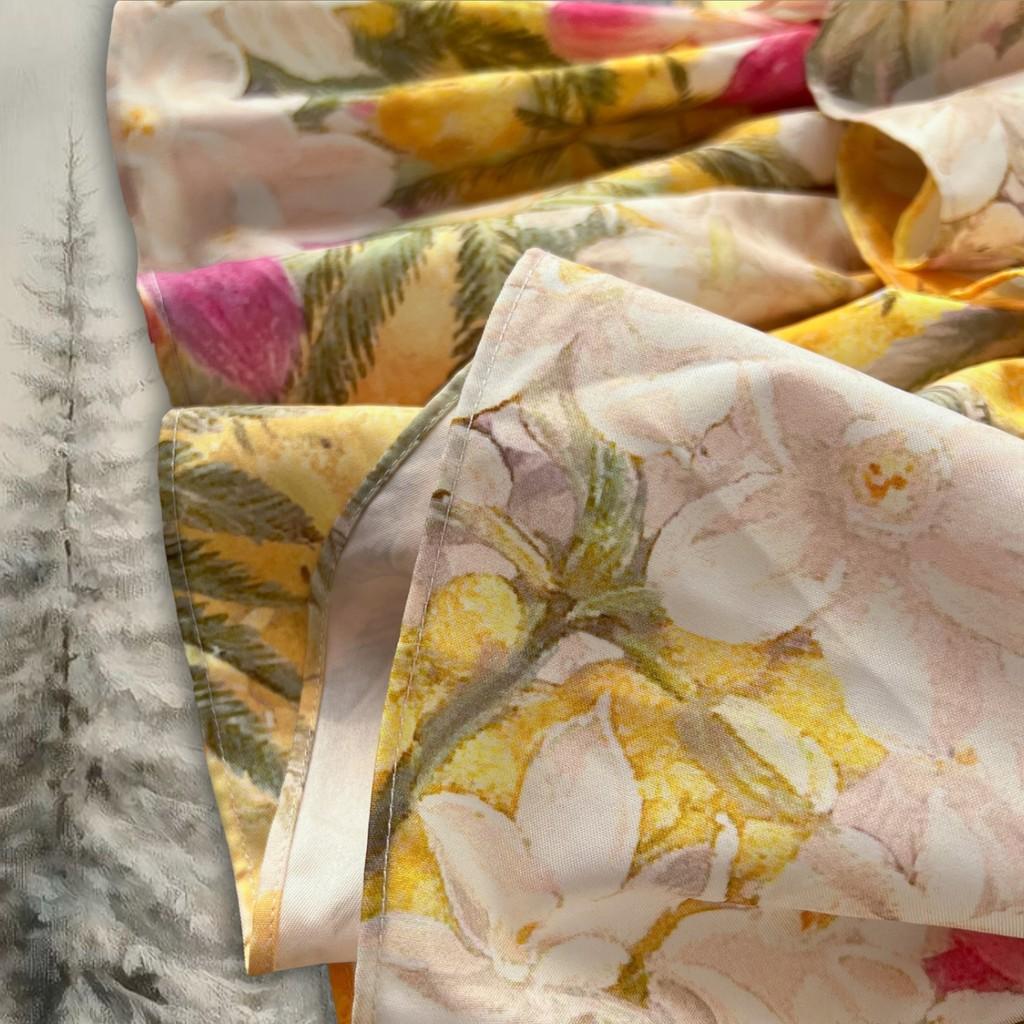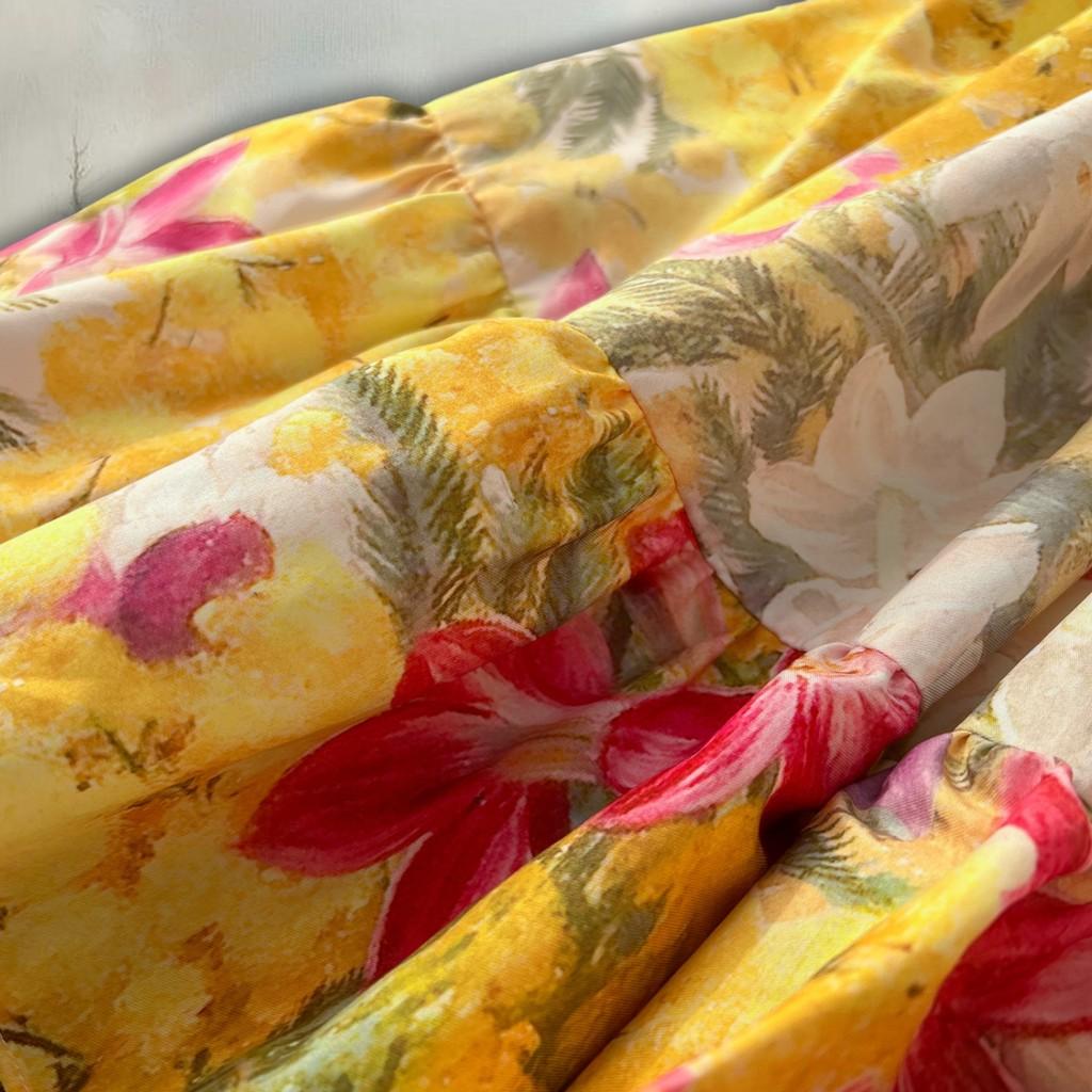 Warna: Kombinasi kuning cerah dengan aksen bunga pink & hijau
