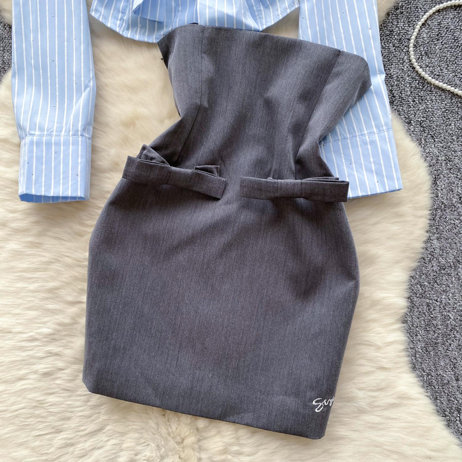 Two-piece set yang effortlessly chic untuk tampil smart & classy seharian! College Set hadir dalam kombinasi warna biru pastel dan abu charcoal yang kalem, cocok untuk kamu yang ingin tampil feminin tapi tetap profesional. Detail kerah besar dan aksen pita kecil di bagian rok bikin look kamu makin standout tanpa usaha berlebihan