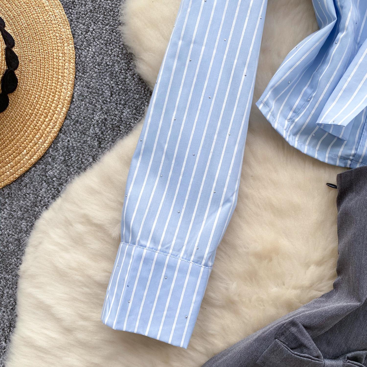 Warna biru pastel dengan motif garis putih vertikal