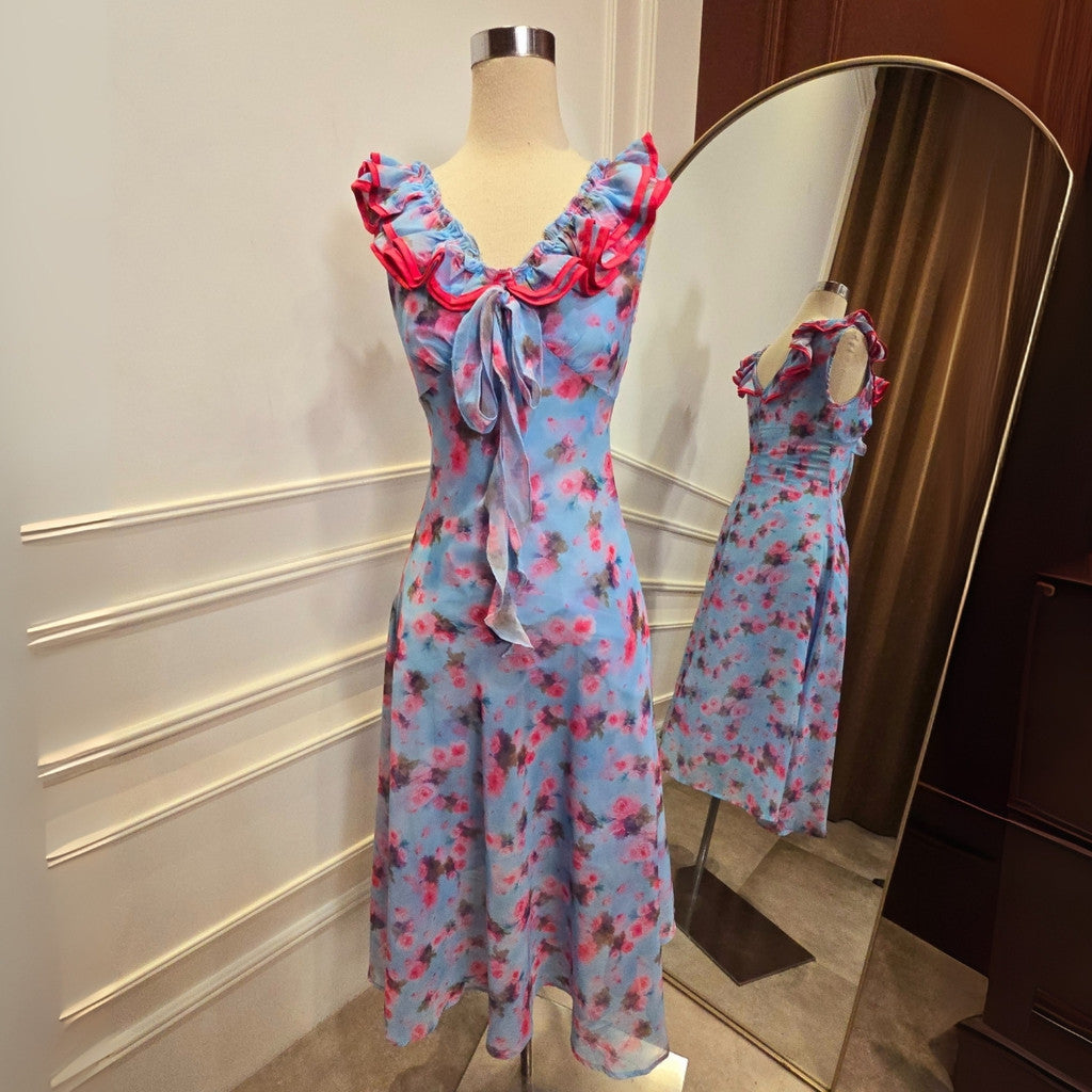Didesain dengan potongan A-line yang flowy, dress ini terbuat dari bahan sifon premium yang adem, ringan, dan jatuh cantik saat dikenakan. Detail ruffle dan pita di bagian dada memberi sentuhan feminin yang klasik sekaligus playful, cocok untuk berbagai kesempatan mulai dari brunch santai, afternoon tea, hingga acara semi-formal.