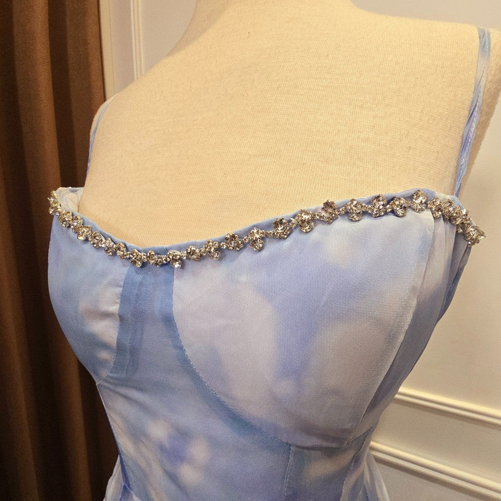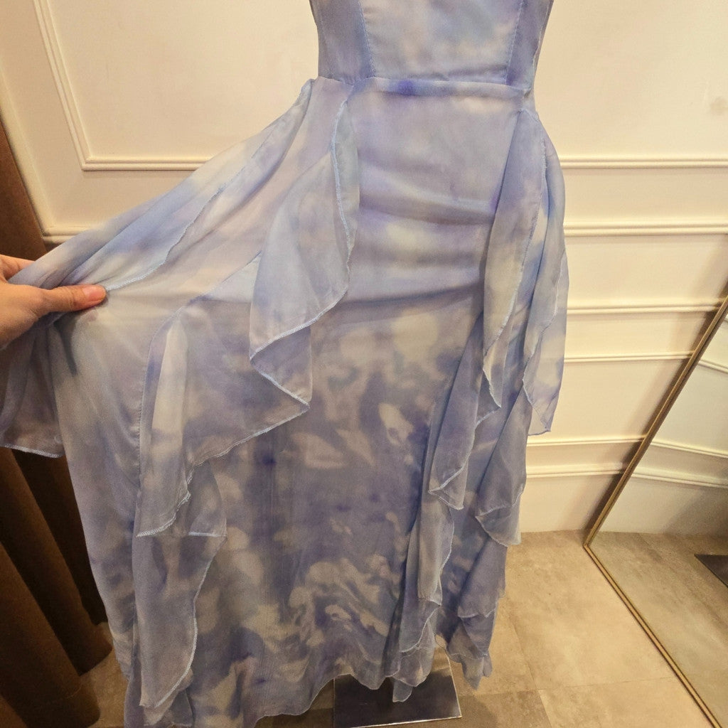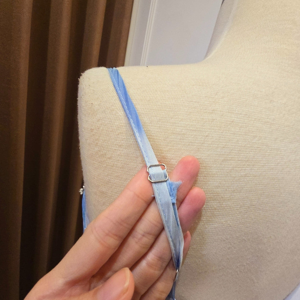 Dress berbahan sifon premium dengan furring lembut di bagian dalam, bikin tampilan flowy, adem, dan super nyaman. Warna biru lembut dengan gradasi seperti lukisan awan memberi sentuhan dreamy dan classy di saat yang sama. Dilengkapi detail ruffle layer yang manis, resleting belakang yang rapi, serta pad busa pada cup dress untuk support yang pas tanpa ribet pakai inner lagi.